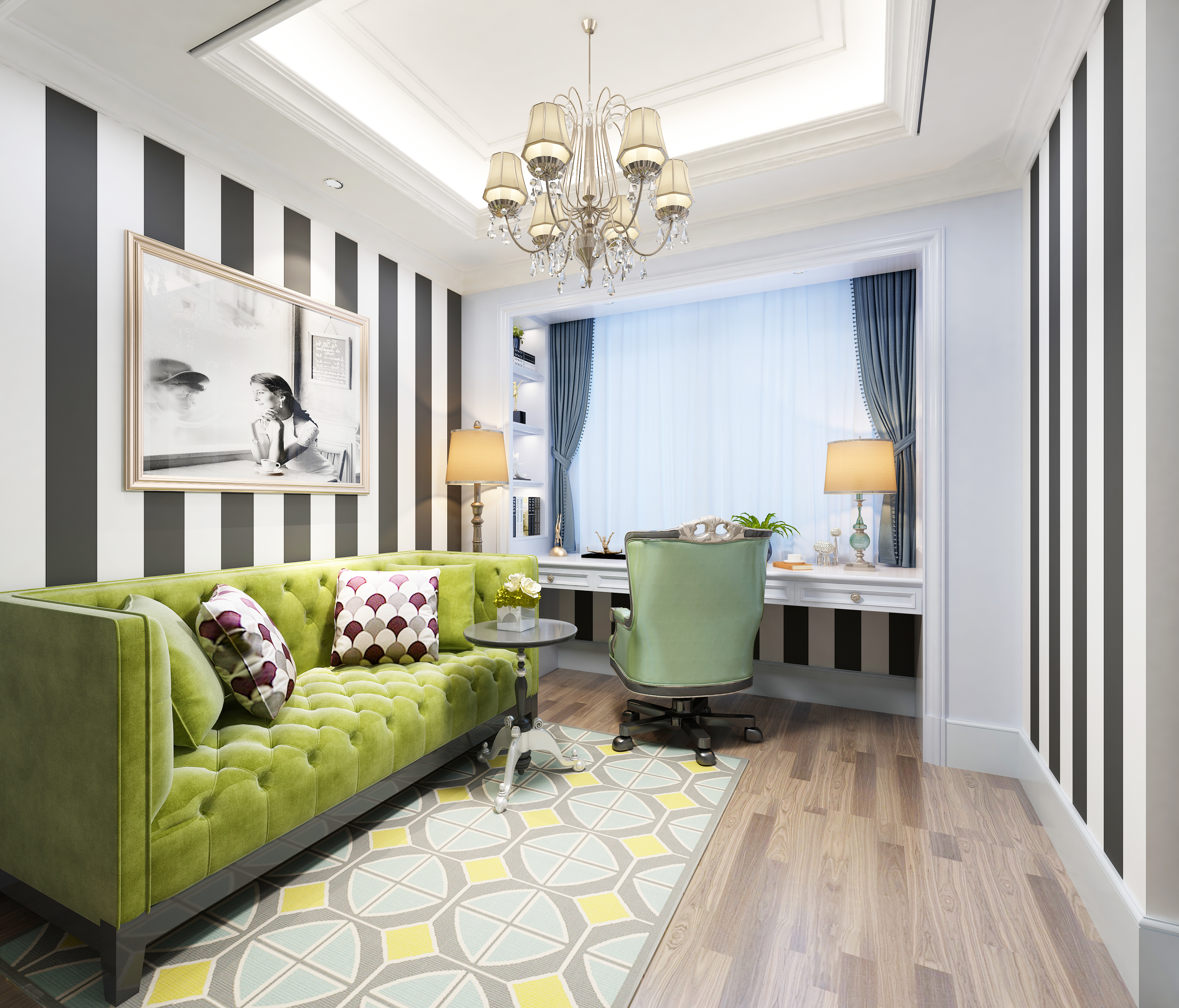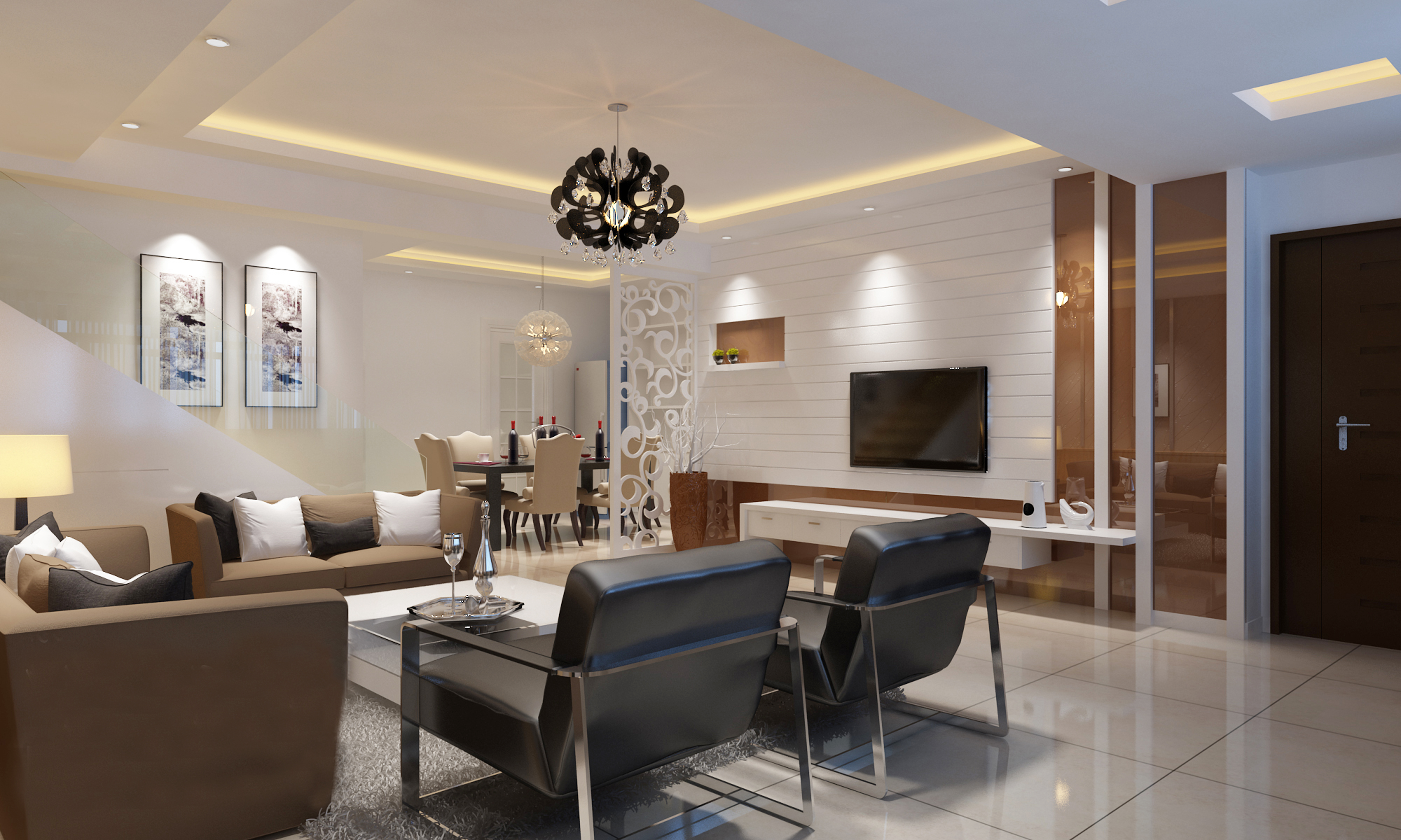 以一個三人客廳沙發(fā)為主,周圍布置單人客廳沙發(fā)、單椅,讓平面疏密有度,營造一個輕松的會客氛圍。